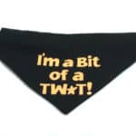 Black 100% cotton dog bandana, featuring a sparkly ‘I’m a Bit of a Tw*t’ print on the front in a choice of colours.